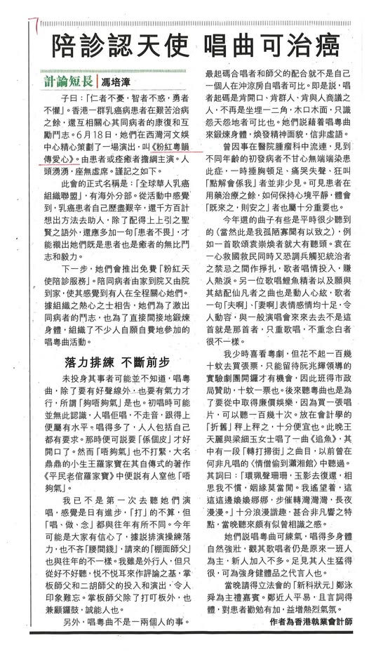 《粉红粤韵传爱心》粤曲慈善演唱会虽然已圆满闭幕,但是鶣鶣漫舞,沥沥莺声,仍在眼前!纵使当日是佳节兼长假期,观众仍有七八成之多!信报专栏的一篇短文,把当天的环节,记录在案,让大家可以重温一下,请参看:http://www1.hkej.com/……/%E9%99%AA%E8%A8%BA%E8%AA……