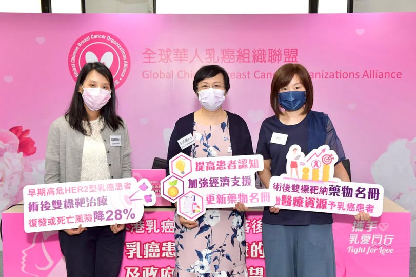 全球华人乳癌组织联盟日前参与了一个关于高复发风险HER2阳性乳癌患者应考虑术后双标靶治疗的记者会。出席活动的嘉宾包括临床肿瘤科专科邱振中医生、「乳您一起」创办人唐智颖女士、HER2病人Crystal,以及本会主席王天凤女士。