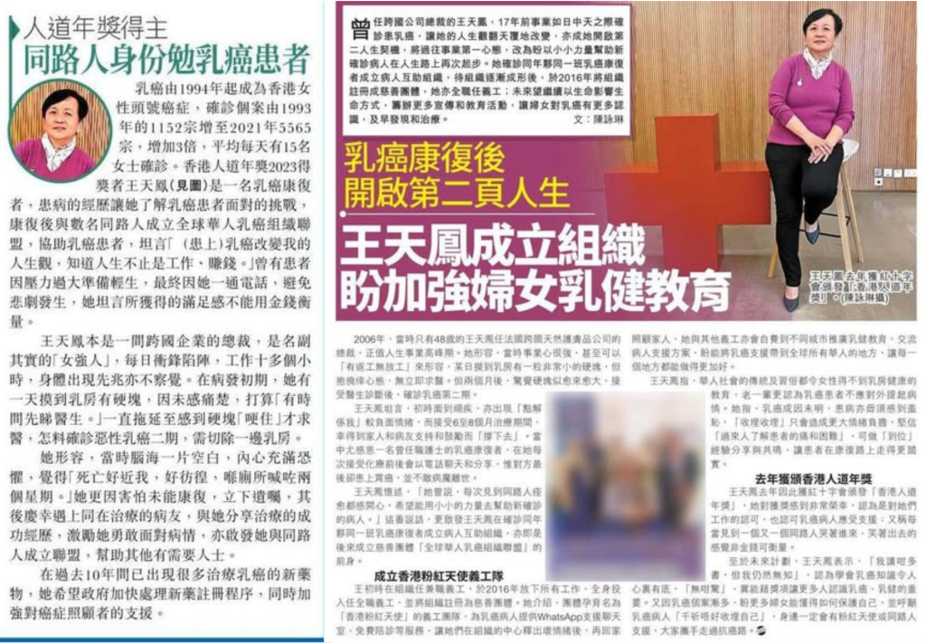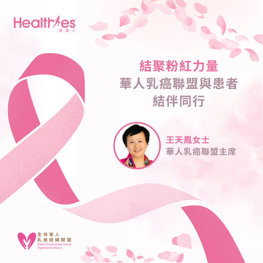 全球华人乳癌组织联盟主席王天鳯女士早前接受网上平台《健康人》专访,分享了联盟成立的初衷,由过来人到投身当义工,再在香港注册「全球华人乳癌组织联盟」为非牟利机构及义务肩负主席职衔……等等,当中的心路历程娓娓道来。多年来的全情投入殊不简单,凭着爱和热诚及毅力,再加上一队齐心有爱的义工团队,陪伴了不少孤单的病友,一步一步向前行。