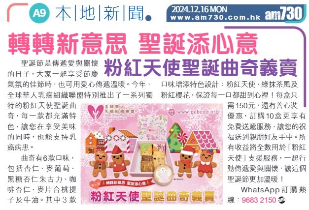 今年圣诞,全球华人乳癌组织联盟推出一系列超靓、超好味、超有意义的圣诞曲奇!六款经典口味+三款特别设计: 牛油、杏仁、咖啡杏仁、麦葡萄、麦片合桃提子、黑糖杏仁朱古力,其中三款特别设计:粉红天使、绿抹茶风及粉红樱花,倍增圣诞气氛!