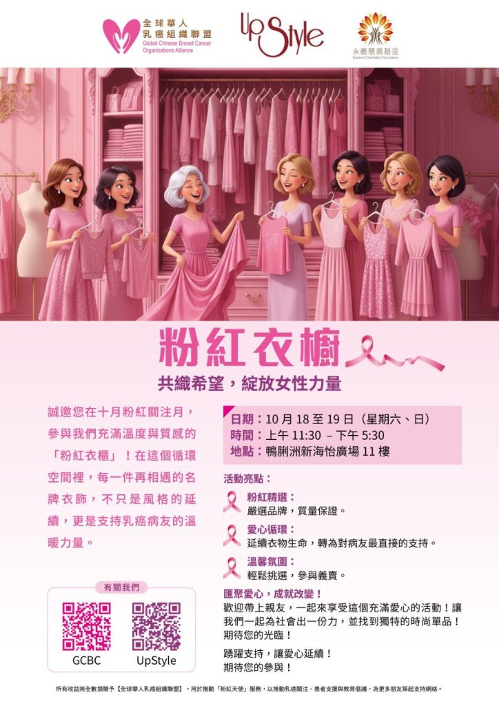 衷心感謝 Upstyle 的鼎力支持!為我們精心搜羅了各式優雅細膩的名牌二手服飾,集結成這次充滿愛心的「粉紅衣廚」慈善義賣。